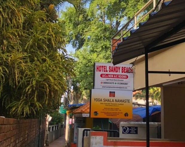 Enter the alley opposite the Police Post near the famous German Bakery (on the Lighthouse Beach waterfront), walk past Hotel Volga Palace and you will see Hotel Sandy Beach on the left hand side.